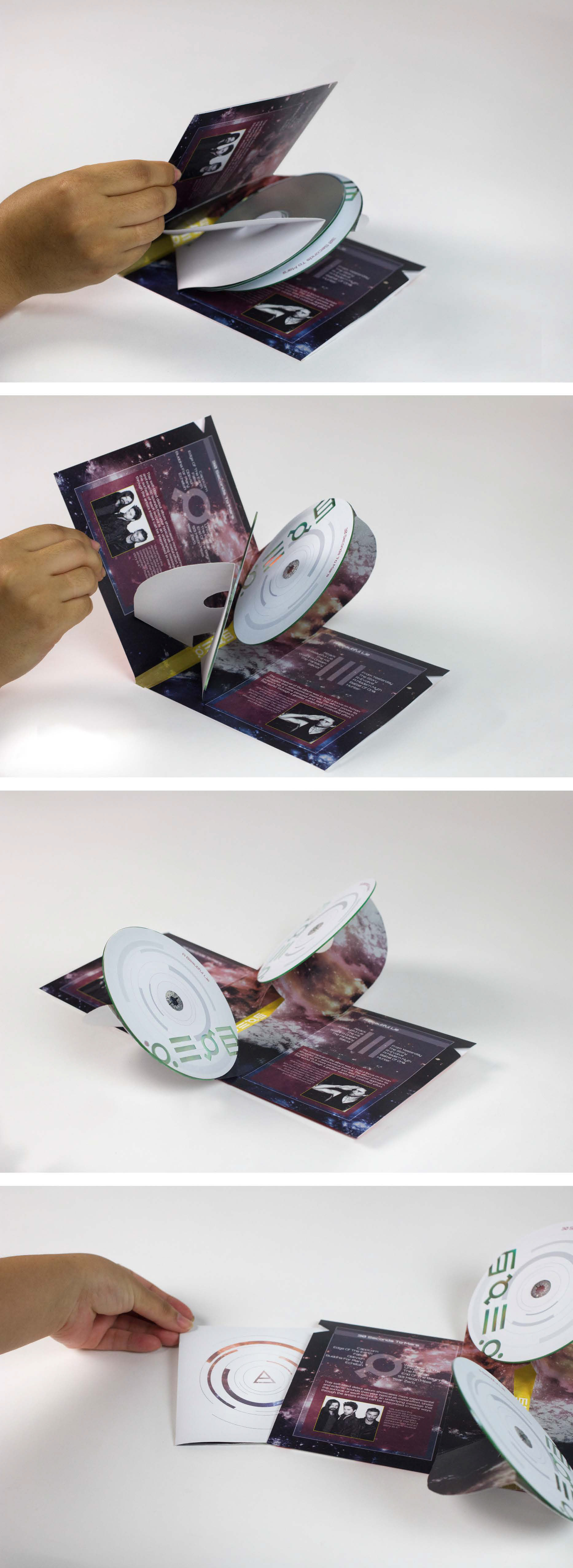 I wanted to create a dynamic experience with a modern design that highlighted the band’s dramatic musical style. The user experience is a revealing evolution reflecting the unique qualities of the band. It begins with the box’s clean triad design, the main symbol for the band. The box then reveals the stark red albums, a dramatic and unexpected contrast to the box packaging. The process of opening the albums contributes to the drama and interaction of the user experience with the pop up system and galactic design, again challenging the expectation of the packaging. The design of the CD's and booklet inserts are white to connect back to the box and tie the set together.